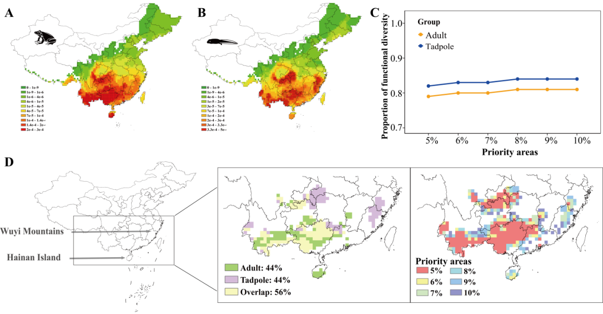图1.成体与蝌蚪的功能多样性分布格局及通过Zonation 5软件划定的优先保护区域。A:成体功能多样性格局;B:蝌蚪功能多样性格局;黑色框线区域内为热点区。C:基于Zonation图层划定的优先区域对成体与蝌蚪功能多样性的覆盖比例;D:蝌蚪与成体功能多样性热点区(前5%)(左图),以及通过Zonation 5识别的前5%-10%优先区域(右图)。